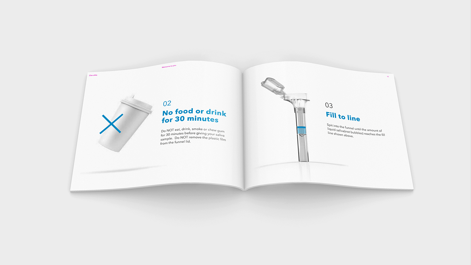 A video animation for in-store kiosks and a new welcome book placed within each 23andMe service kit. Both assets where designed as apart of an effort to educate consumers on the 23andMe kit experience in a more playful and engaging way.